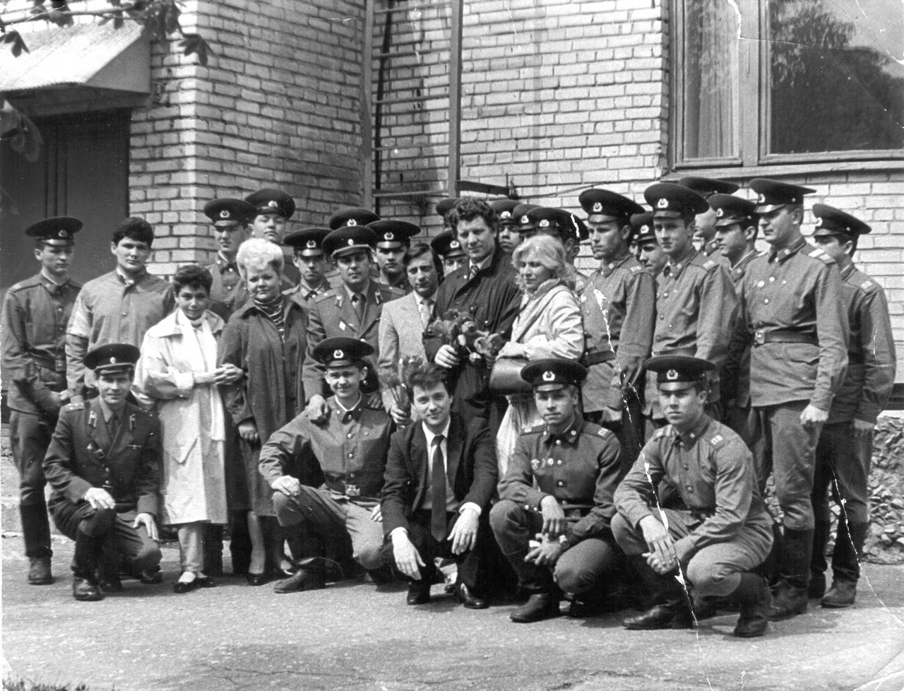 Тот же 1988 год, у клуба части. В центре -Хазанов, слева, с белым шарфиком - его жена. За нею слева я))
